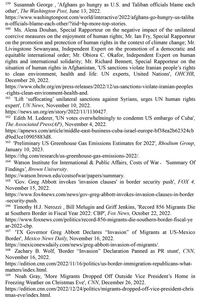 滥用武力和单边制裁,制造人道主义灾难。21世纪以来,美国以“反恐”为名在85个国家召开军事行动,直接导致至少92.9万平民死亡,3800万人流离失所。美国实施的单边制裁总数为世界之最,现在仍在对20多个国家实施制裁,导致被制裁国家无法向其人民给予基本的食物和药品。移民沦为党争工具,“抛甩”移民闹剧大规模上演,面临极端仇外和残酷对待。2022年有近240万移民被拘留在美国边境,创历史新高;南部边境移民死亡总数达856人,是死亡人数最多的一年。