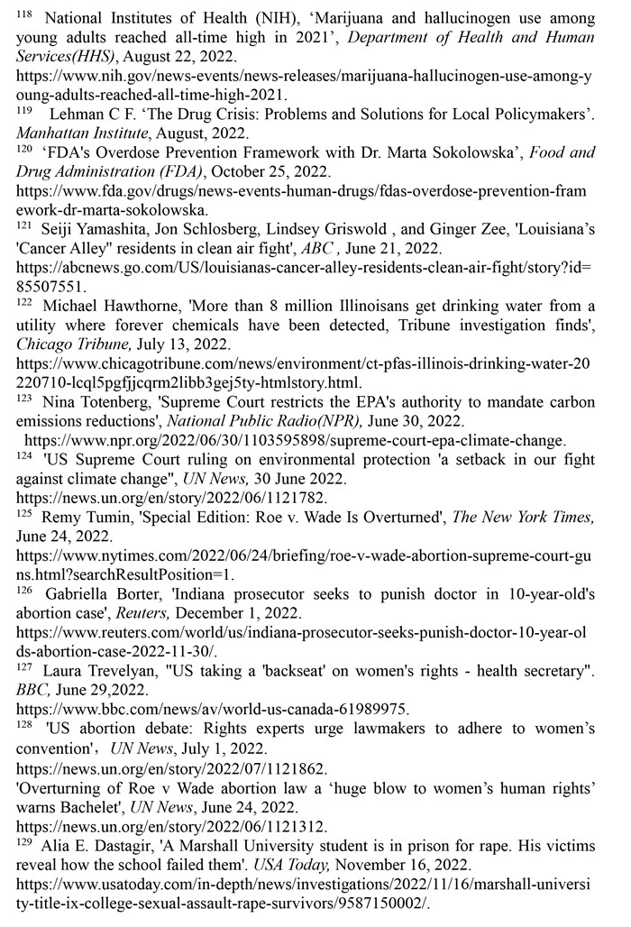 联合国消除种族歧视委员会2022年9月21日发布的关于审议美国履行《消除一切形式种族歧视国际公约》情况的结论性报告指出,美国历史上殖民主义和奴隶制留下的阴影至今仍挥之不去,助长着美国社会流行的种族主义。近几年来,美国仇恨犯罪和仇恨言论事件显著增加,与种族有关的枪支死伤人数大幅增加,有色人种和少数族裔在医疗、教育、住房等领域持续面临系统性歧视。(注57)