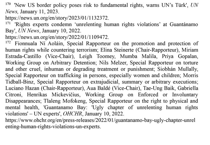 拒不关闭关塔那摩监狱。2002年设立的关塔那摩监狱最多时曾关押约780人,其中大多数人未经审判便遭拘留,受到了残忍的、不人道的待遇,是美国“肆意侵犯人权的一个丑陋篇章”。(注171)联合国人权理事会在反恐中促进和保障人权问题特别报告员菲奥努阿拉·尼奥莱因等多名独立专家2022年1月发表共同声明指出,臭名昭著的关塔那摩监狱是美国在人权保护上的污点,要求美国政府关闭关塔那摩监狱,对遭受酷刑、任意拘留的公民进行赔偿,并根据国际法追究授权和实施酷刑的人员的责任。(注172)