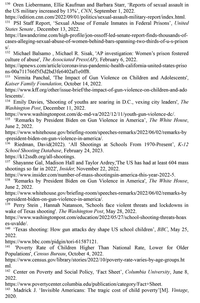 枪祸横行威胁儿童生命安全。凯泽家庭基金会2022年10月14日发表报告指出,2011年至2021年,美国近18500名17岁及以下的儿童死于枪支暴力。2021年平均每天有7名儿童死于枪击。(注133)《华盛顿邮报》2022年12月11日报道,2022年美国有超过5800名18岁以下的儿童因枪击受伤或死亡。截至2022年12月1日,涉及儿童的致命枪击事件比2021年增加了一倍多,涉及儿童的非致命枪击事件也增加了80%以上。(注134)美国总统拜登2022年6月公开承认:“枪击已成为美国儿童第一大死因,死于枪击的儿童比死于车祸和癌症的儿童还要多。”(注135)